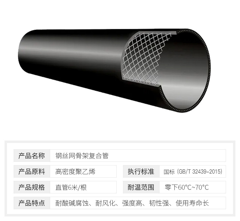 PE鋼絲網(wǎng)骨架塑料復(fù)合管是以高強(qiáng)度鋼絲和聚乙烯塑料為原材料,以纏繞成型的高繩度鋼絲為芯層,以高密度聚乙烯塑料為內(nèi)、外層 ,形成整體管壁的一種新型復(fù)合結(jié)構(gòu)管材。復(fù)合管加入鋼絲增強(qiáng)網(wǎng),不但在管材耐壓能力上比PE實(shí)壁管有了很大的提高,同時(shí)還保留了PE實(shí)壁管優(yōu)異的耐腐蝕性、無(wú)水垢等特點(diǎn)。其增強(qiáng)體被包覆在連續(xù)熱熔性塑料之中,保證了鋼絲與外界的隔離,使得鋼絲的使用壽命更長(zhǎng)久,保證管材長(zhǎng)久的耐幫性能。